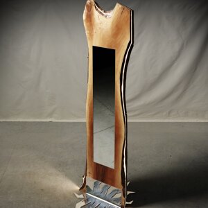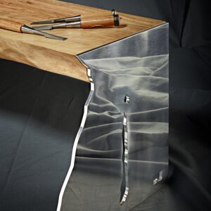 A remarkable example of 16th century italian olive wood. The wood vein design and shading of this seat creates an intense visual impact. The leg is made from 10 mm stainless steel which has been polished to a mirror-like finish. The steel leg is an exact replica of the one created in wood. This astonishing section of italian olive wood has been naturally dried for 22 years! It has been hand finished using a natural wax.