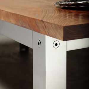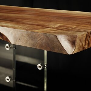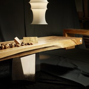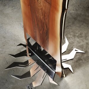 Quattro slanciatissime gambe di formidabile manifattura in acciaio inox spessore 8mm lucidato a specchio sorreggono questo ineguagliabile monolite di noce nostrano dall'aspetto marmoreo e vellutato.