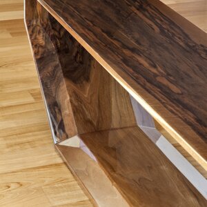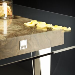 This inimitable monolite of Italian walnut is supported by four slender legs of remarkable craftsmanship made from 8 mm stainless steel which have been polished to a mirror-like quality. The wood maintains its velvet and marble -like intensity. With the addition of the crystal, this work transforms itself into a centerpiece of absolute elegance.