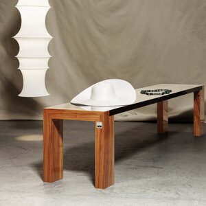Favolosa panca dall'aspetto esotico, realizzata da un'unica sezione di “Panga Panga”della regione di Enclave de Cabinda in Angola, sorretta da due gambe in ulivo. Ben sei le mani di finitura lucida per questo effetto a specchio.